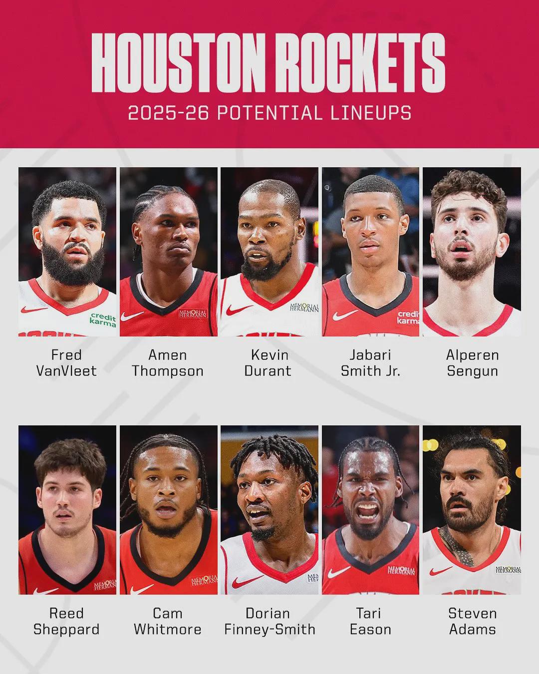 拿下凯文杜兰特后,他们的阵容似乎比2024-25赛季更强大。后卫线阿门汤普森、范弗利特,中锋申京、亚当斯,锋线凯文杜兰特和贾巴里史密斯,几乎每个位置都有攻防一体的球员。上赛季在季后赛不敌金州勇士队,主要是杰伦格林的单兵输出能力不行,无法给予申京更多的进攻支援,拥有凯文杜兰特之后,他们的进攻火力,将提升一个等级。
